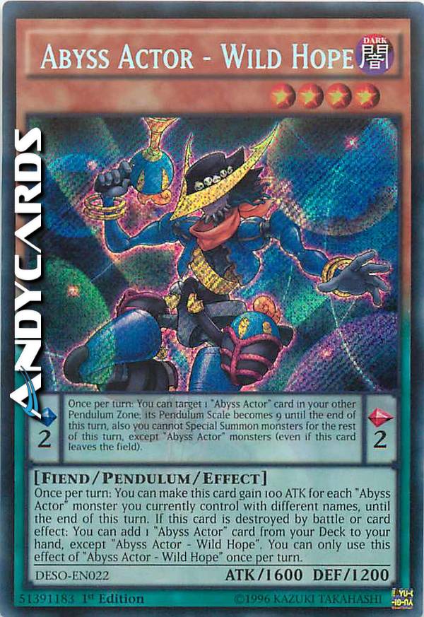 2 Una volta per turno: puoi scegliere come bersaglio 1 carta "Attore dell'Abisso" nella tua altra Zona Pendulum; il suo Valore Pendulum diventa 9 fino alla fine di questo turno, inoltre non puoi Evocare Specialmente mostri per il resto di questo turno, eccetto mostri "Attore dell'Abisso" (anche se questa carta lascia il Terreno). Una volta per turno: puoi far guadagnare a questa carta 100 ATK per ogni mostro "Attore dell'Abisso" che controlli attualmente con nomi diversi, fino alla fine di questo turno. Se questa carta viene distrutta in battaglia o dall'effetto di una carta: puoi aggiungere 1 carta "Attore dell'Abisso" dal tuo Deck alla tua mano, eccetto "Attore dell'Abisso - Speranza Selvaggia". Puoi utilizzare questo effetto di "Attore dell'Abisso - Speranza Selvaggia" una sola volta per turno.