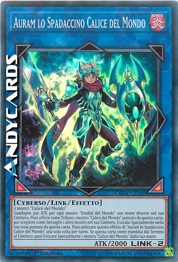 2 mostri "Calice del Mondo" - Guadagna 300 ATK per ogni mostro "Eredità del Mondo" con nome diverso nel tuo Cimitero. Puoi offrire come Tributo 1 mostro "Calice del Mondo" puntato da questa carta, poi scegliere come bersaglio 1 altro mostro nel tuo Cimitero; Evocalo Specialmente nella tua zona puntata da questa carta. Puoi utilizzare questo effetto di "Auram lo Spadaccino Calice del Mondo" una sola volta per turno. Se questa carta viene mandata dal Terreno al Cimitero: puoi Evocare Specialmente 1 mostro "Calice del Mondo" dalla tua mano.