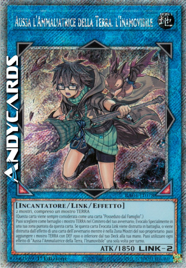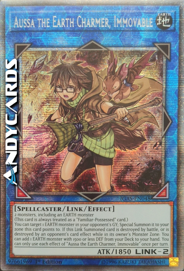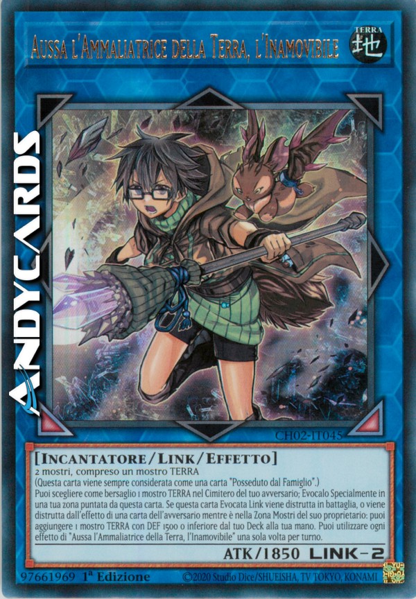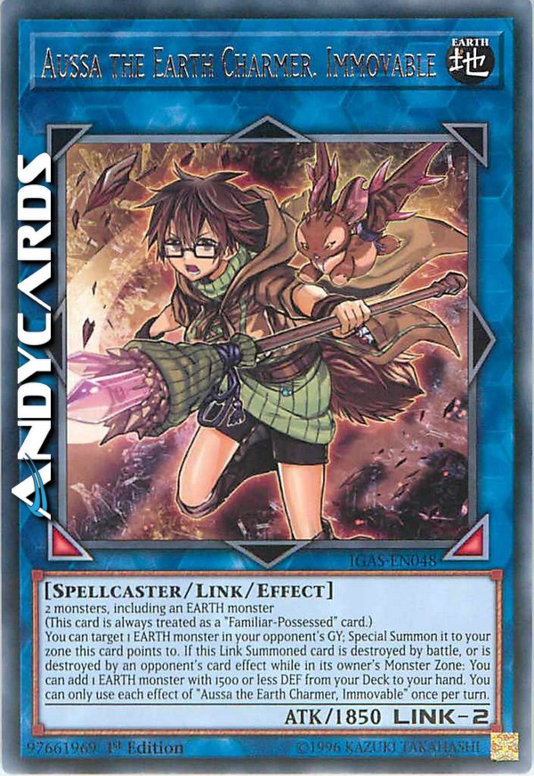 2 mostri, compreso un mostro TERRA (Questa carta viene sempre considerata come una carta "Posseduto dal Famiglio".) Puoi scegliere come bersaglio 1 mostro TERRA nel Cimitero del tuo avversario; Evocalo Specialmente in una tua zona puntata da questa carta. Se questa carta Evocata Link viene distrutta in battaglia, o viene distrutta dall'effetto di una carta dell'avversario mentre è nella Zona Mostri del suo proprietario: puoi aggiungere 1 mostro TERRA con DEF 1500 o inferiore dal tuo Deck alla tua mano. Puoi utilizzare ogni effetto di "Aussa l'Ammaliatrice della Terra, l'Inamovibile" una sola volta per turno.