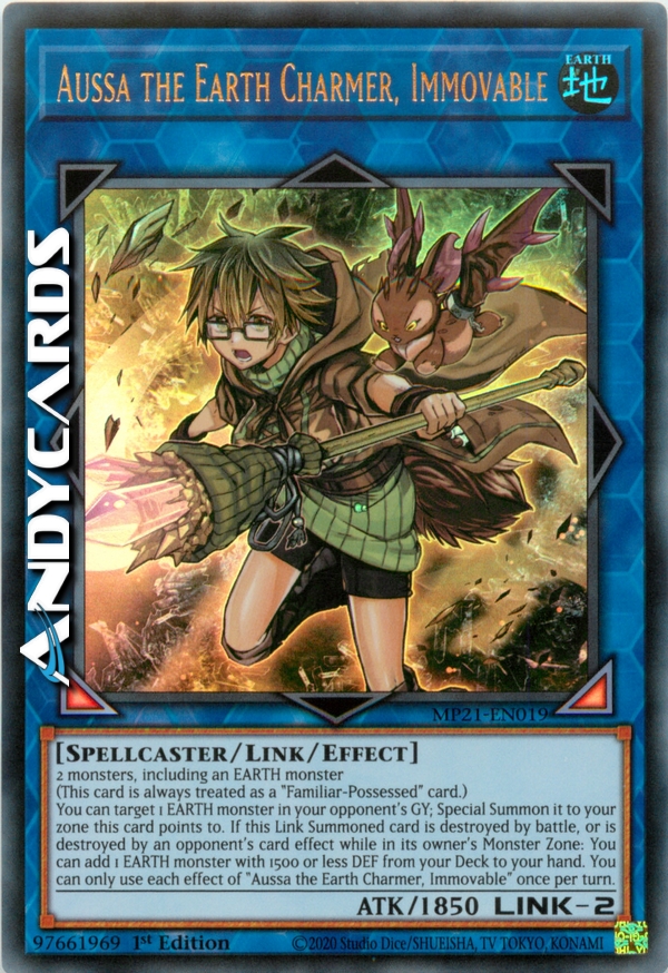 2 monsters, including an EARTH monster (This card is always treated as a "Familiar-Possessed" card.) You can target 1 EARTH monster in your opponent's GY; Special Summon it to your zone this card points to. If this Link Summoned card is destroyed by battle, or is destroyed by an opponent's card effect while in its owner's Monster Zone: You can add 1 EARTH monster with 1500 or less DEF from your Deck to your hand. You can only use each effect of "Aussa the Earth Charmer, Immovable" once per turn.
