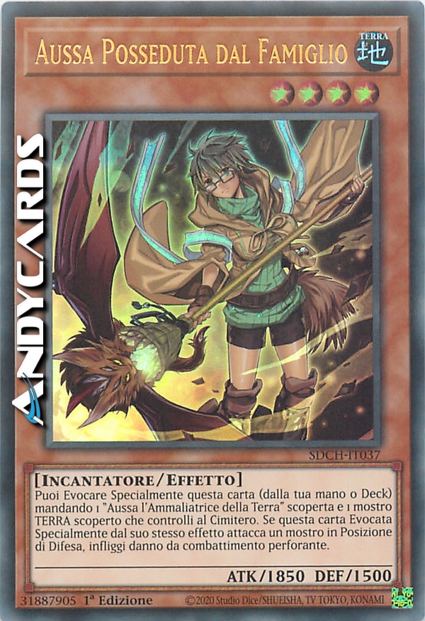 Puoi Evocare Specialmente questa carta (dalla tua mano o Deck) mandando 1 "Aussa l'Ammaliatrice della Terra" scoperta e 1 mostro TERRA scoperto che controlli al Cimitero. Se questa carta Evocata Specialmente dal suo effetto attacca un mostro in Posizione di Difesa, infliggi danno da combattimento perforante al tuo avversario.