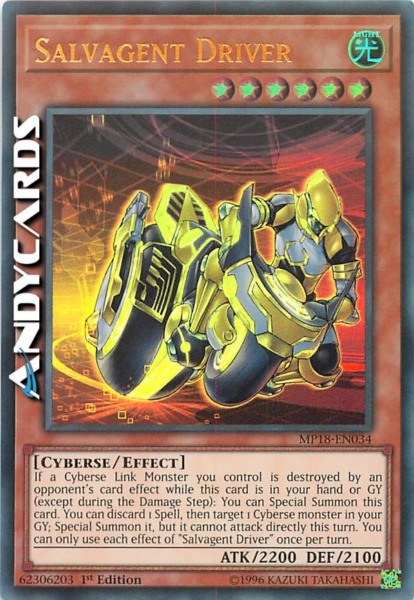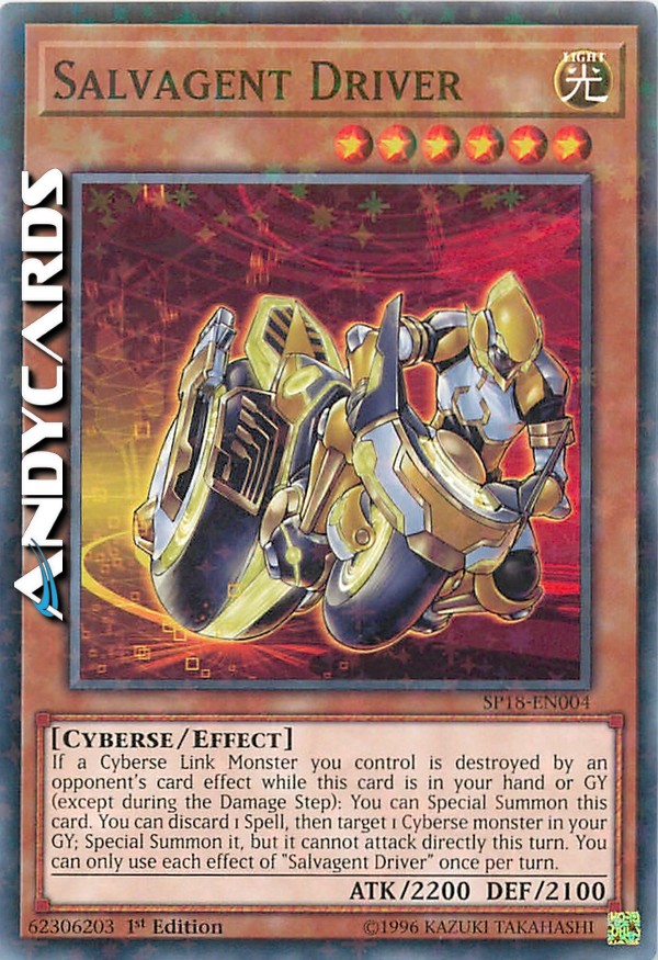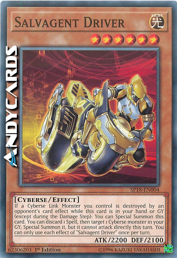 If a Cyberse Link Monster you control is destroyed by an opponent's card effect while this card is in your hand or GY (except during the Damage Step): You can Special Summon this card. You can discard 1 Spell, then target 1 Cyberse monster in your GY; Special Summon it, but it cannot attack directly this turn. You can only use each effect of "Salvagent Driver" once per turn.