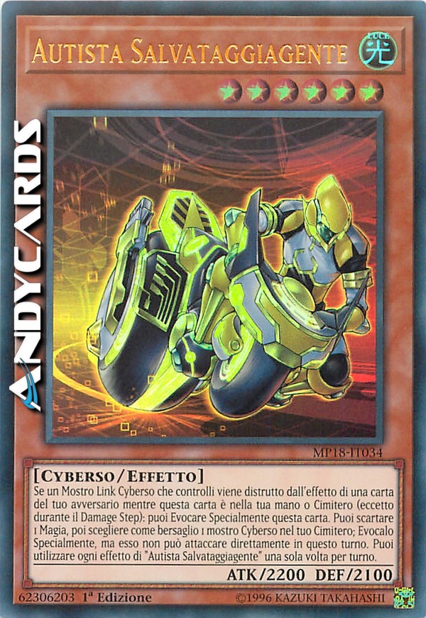 Se un Mostro Link Cyberso che controlli viene distrutto dall'effetto di una carta del tuo avversario mentre questa carta è nella tua mano o Cimitero (eccetto durante il Damage Step): puoi Evocare Specialmente questa carta. Puoi scartare 1 Magia, poi scegliere come bersaglio 1 mostro Cyberso nel tuo Cimitero; Evocalo Specialmente, ma esso non può attaccare direttamente in questo turno. Puoi utilizzare ogni effetto di "Autista Salvataggiagente" una sola volta per turno.
