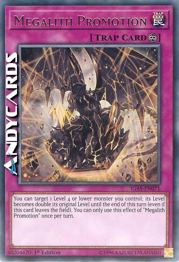 Puoi scegliere come bersaglio 1 mostro di Livello 4 o inferiore che controlli; il suo Livello diventa il doppio del suo Livello originale fino alla fine di questo turno (anche se questa carta lascia il Terreno). Puoi utilizzare questo effetto di "Avanzamento Megalito" una sola volta per turno.