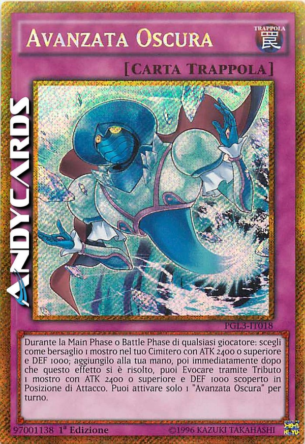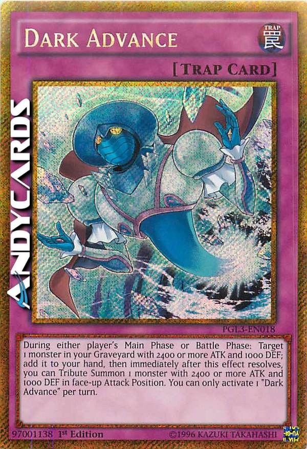 Durante la Main Phase o Battle Phase di qualsiasi giocatore: scegli come bersaglio 1 mostro nel tuo Cimitero con ATK 2400 o superiore e DEF 1000; aggiungilo alla tua mano, poi immediatamente dopo che questo effetto si è risolto, puoi Evocare tramite Tributo 1 mostro con ATK 2400 o superiore e DEF 1000 scoperto in Posizione di Attacco. Puoi attivare solo 1 "Avanzata Oscura" per turno.