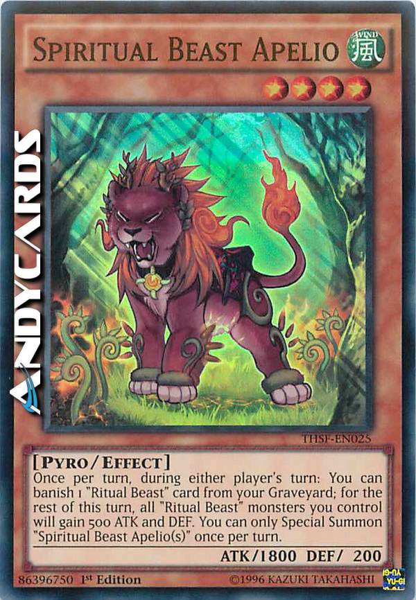 Una volta per turno, durante il turno di qualsiasi giocatore: puoi bandire 1 carta "Bestia Spirito" dal tuo Cimitero; per il resto di questo turno, tutti i mostri "Bestia Spirito" che controlli guadagneranno 500 ATK e DEF. Puoi Evocare Specialmente uno o più "Avatar Bestia Spirito Apelio" una sola volta per turno.