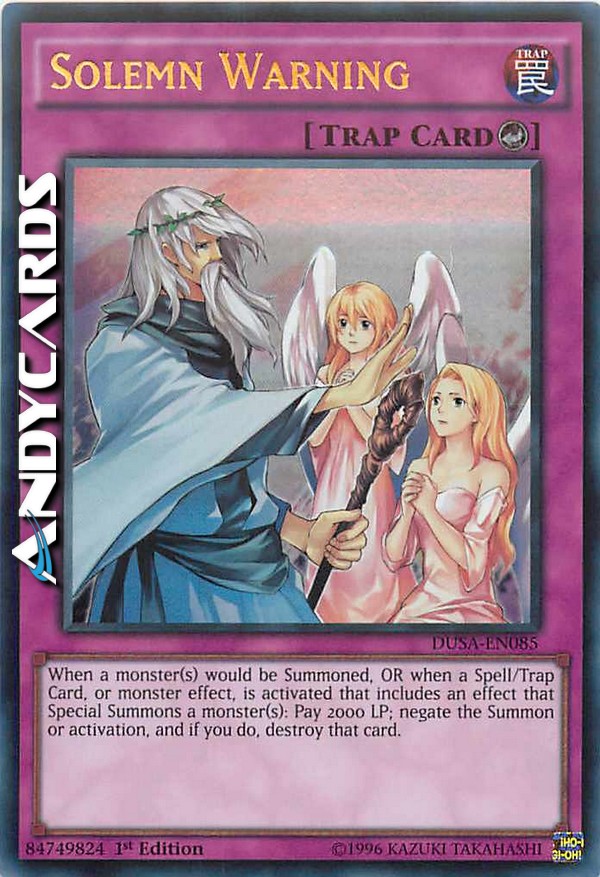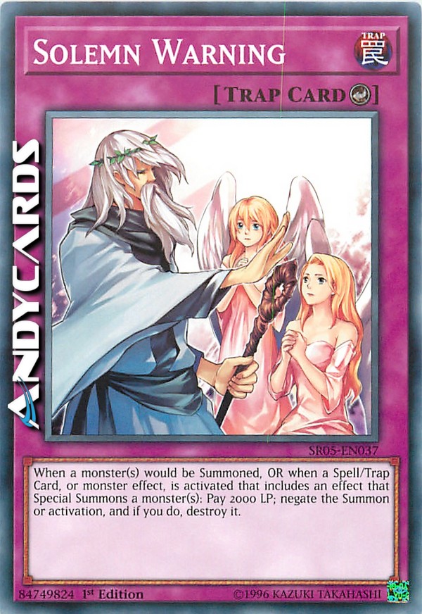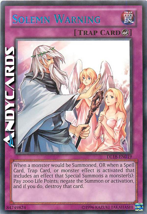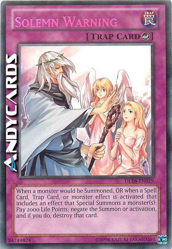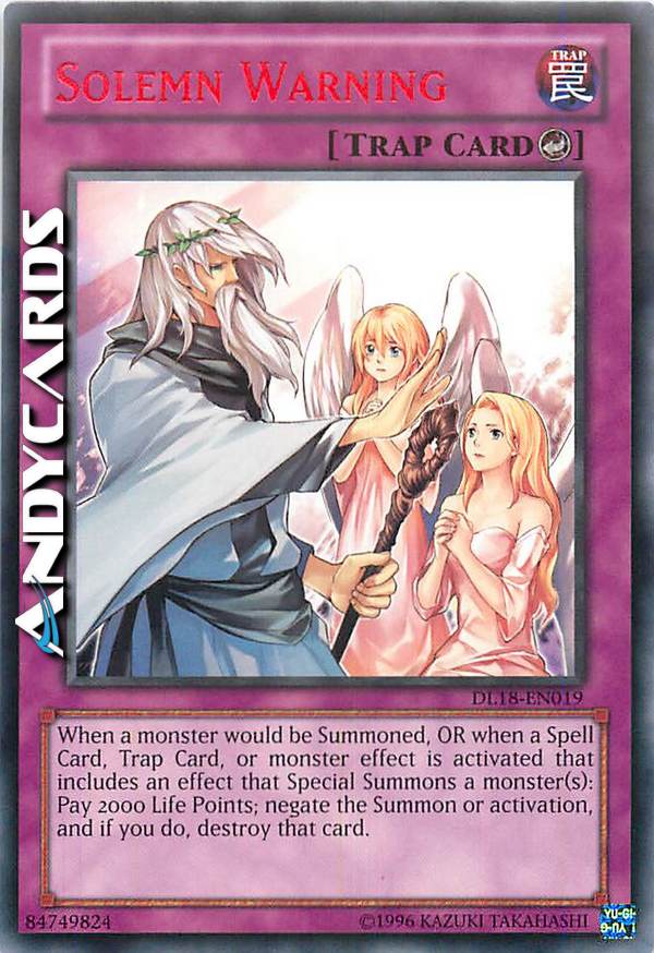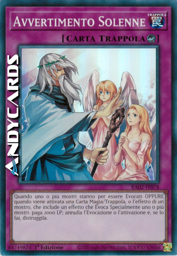 Quando sta per essere Evocato un mostro OPPURE quando viene attivata una Carta Magia, Carta Trappola o l'effetto di un Mostro con Effetto che include un effetto che Evoca Specialmente uno o più mostri: paga 2000 Life Point; annulla l'Evocazione oppure l'attivazione e, se lo fai, distruggi quella carta.