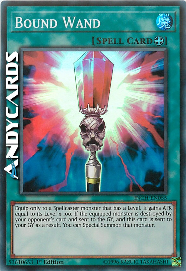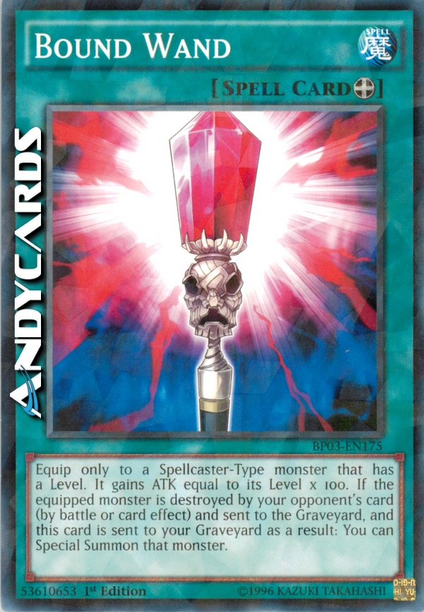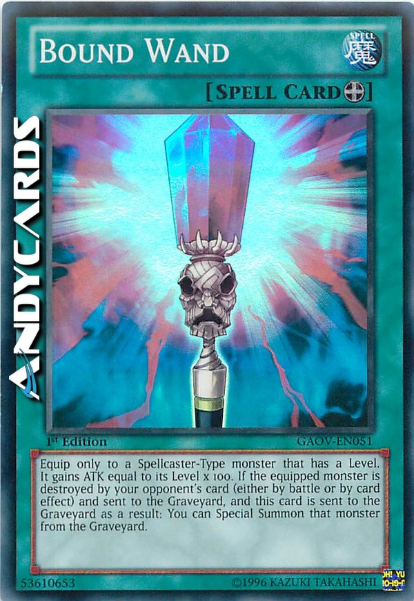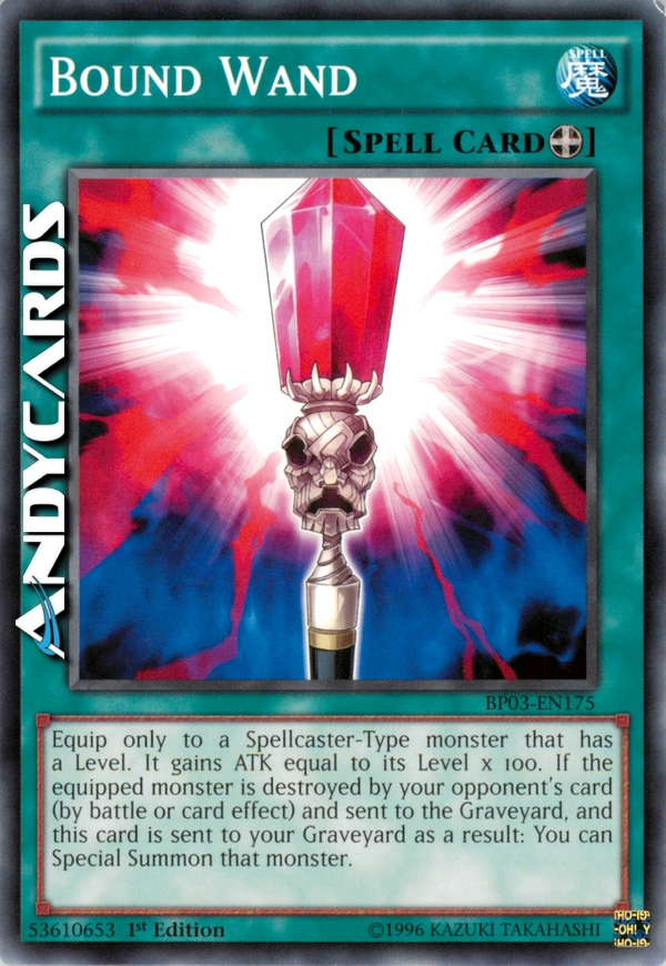 Equip only to a Spellcaster-Type monster that has a Level. It gains ATK equal to its Level × 100. If the equipped monster is destroyed by your opponent's card (either by battle or card effect) and sent to the Graveyard, and this card is sent to the Graveyard as a result: You can Special Summon that monster from the Graveyard.