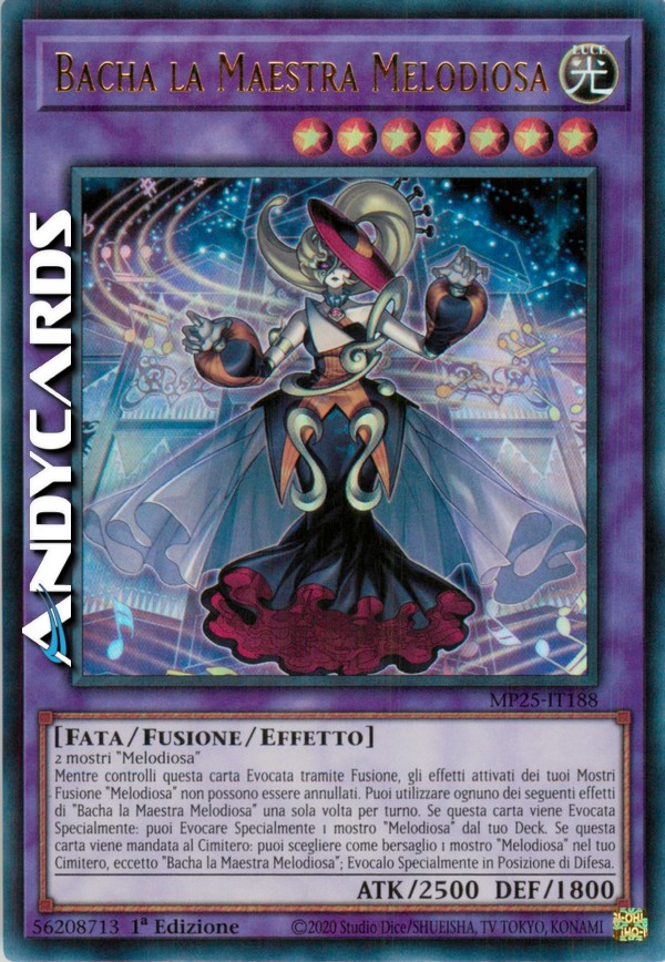 Mentre controlli questa carta Evocata tramite Fusione, gli effetti attivati dei tuoi Mostri Fusione "Melodiosa" non possono essere annullati. Puoi utilizzare ognuno dei seguenti effetti di "Bacha la Maestra Melodiosa" una sola volta per turno. Se questa carta viene Evocata Specialmente: puoi Evocare Specialmente 1 mostro "Melodiosa" dal tuo Deck. Se questa carta viene mandata al Cimitero: puoi scegliere come bersaglio 1 mostro "Melodiosa" nel tuo Cimitero, eccetto "Bacha la Maestra Melodiosa"; Evocalo Specialmente in Posizione di Difesa.