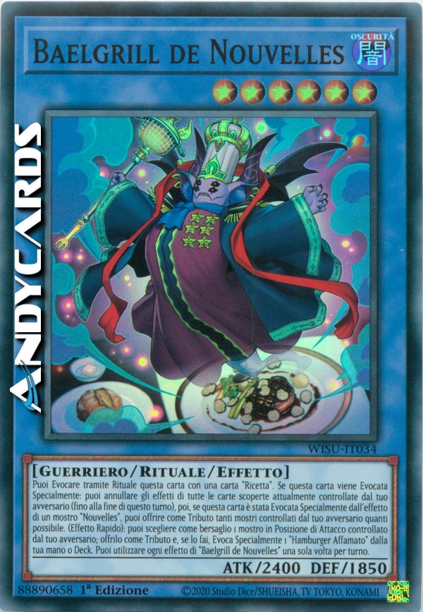 Puoi Evocare tramite Rituale questa carta con una carta "Ricetta". Se questa carta viene Evocata Specialmente: puoi annullare gli effetti di tutte le carte scoperte attualmente controllate dal tuo avversario (fino alla fine di questo turno), poi, se questa carta è stata Evocata Specialmente dall'effetto di un mostro "Nouvelles", puoi offrire come Tributo tanti mostri controllati dal tuo avversario quanti possibile. (Effetto Rapido): puoi scegliere come bersaglio 1 mostro in Posizione di Attacco controllato dal tuo avversario; offrilo come Tributo e, se lo fai, Evoca Specialmente 1 "Hamburger Affamato" dalla tua mano o Deck. Puoi utilizzare ogni effetto di "Baelgrill de Nouvelles" una sola volta per turno.