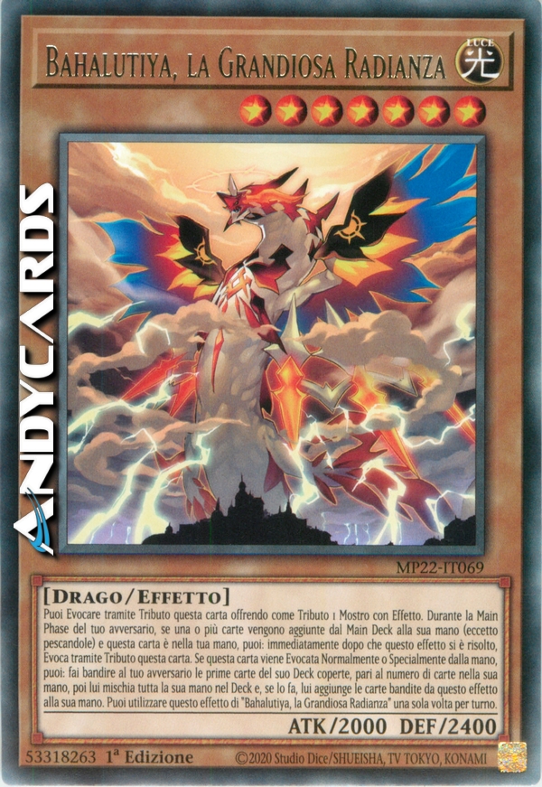 Puoi Evocare tramite Tributo questa carta offrendo come Tributo 1 Mostro con Effetto. Durante la Main Phase del tuo avversario, se una o più carte vengono aggiunte dal Main Deck alla sua mano (eccetto pescandole) e questa carta è nella tua mano, puoi: immediatamente dopo che questo effetto si è risolto, Evoca tramite Tributo questa carta. Se questa carta viene Evocata Normalmente o Specialmente dalla mano, puoi: fai bandire al tuo avversario le prime carte del suo Deck coperte, pari al numero di carte nella sua mano, poi lui mischia tutta la sua mano nel Deck e, se lo fa, lui aggiunge le carte bandite da questo effetto alla sua mano. Puoi utilizzare questo effetto di "Bahalutiya, la Grandiosa Radianza" una sola volta per turno.