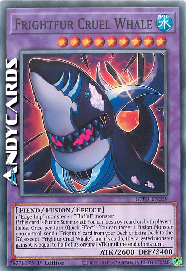 If this card is Fusion Summoned: You can destroy 1 card on both players' fields. Once per turn (Quick Effect): You can target 1 Fusion Monster you control; send 1 "Frightfur" card from your Deck or Extra Deck to the GY, except "Frightfur Cruel Whale", and if you do, the targeted monster gains ATK equal to half of its original ATK until the end of this turn.