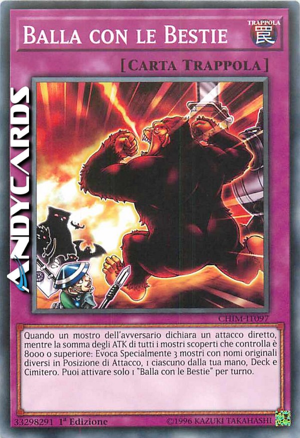 Quando un mostro dell'avversario dichiara un attacco diretto, mentre la somma degli ATK di tutti i mostri scoperti che controlla è 8000 o superiore: Evoca Specialmente 3 mostri con nomi originali diversi in Posizione di Attacco, 1 ciascuno dalla tua mano, Deck e Cimitero. Puoi attivare solo 1 "Balla con le Bestie" per turno.