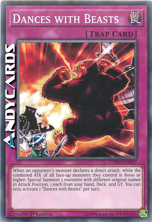 When an opponent's monster declares a direct attack, while the combined ATK of all face-up monsters they control is 8000 or higher: Special Summon 3 monsters with different original names in Attack Position, 1 each from your hand, Deck, and GY. You can only activate 1 "Dances with Beasts" per turn.