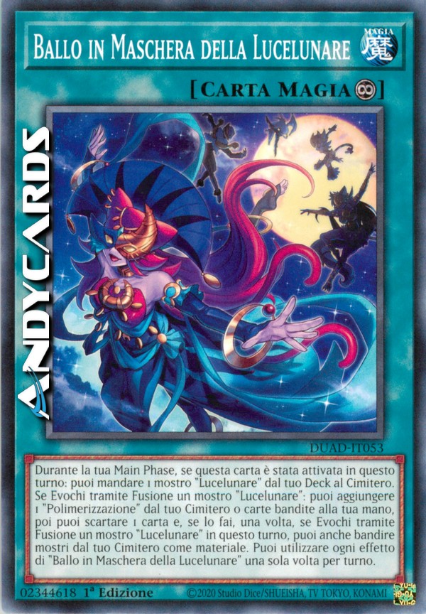 Durante la tua Main Phase, se questa carta è stata attivata in questo turno: puoi mandare 1 mostro "Lucelunare" dal tuo Deck al Cimitero. Se Evochi tramite Fusione un mostro "Lucelunare": puoi aggiungere 1 "Polimerizzazione" dal tuo Cimitero o carte bandite alla tua mano, poi puoi scartare 1 carta e, se lo fai, una volta, se Evochi tramite Fusione un mostro "Lucelunare" in questo turno, puoi anche bandire mostri dal tuo Cimitero come materiale. Puoi utilizzare ogni effetto di "Ballo in Maschera della Lucelunare" una sola volta per turno.