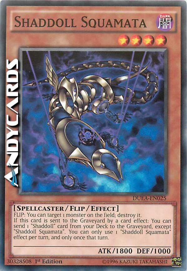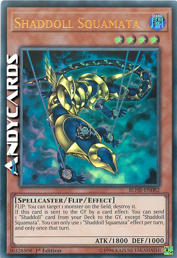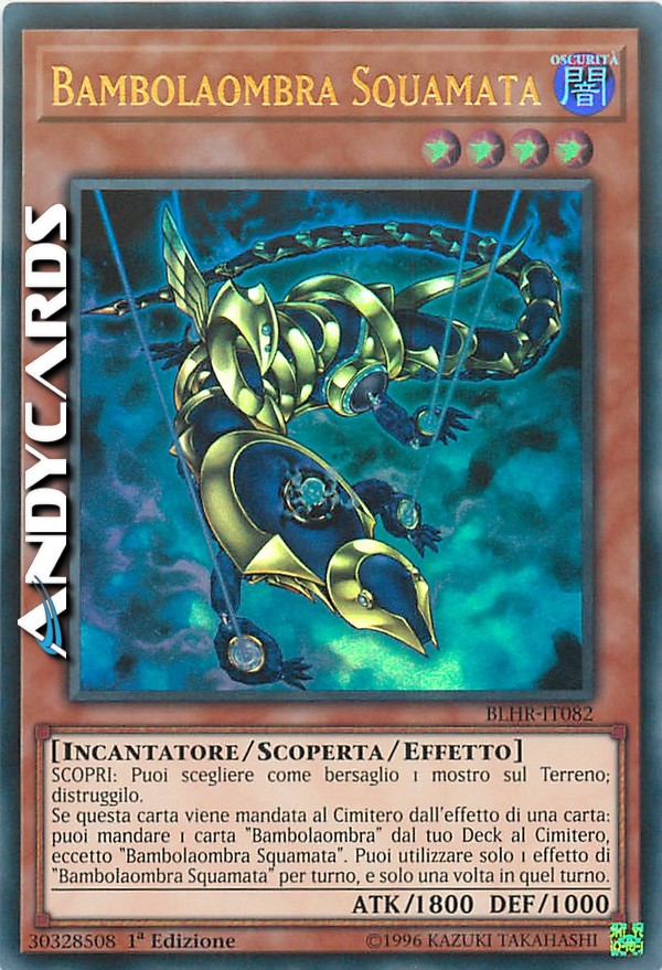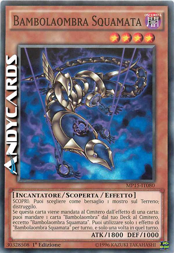 SCOPRI: puoi scegliere come bersaglio 1 mostro sul Terreno; distruggilo. Se questa carta viene mandata al cimitero dall'effetto di una carta: puoi mandare 1 carta "babolaombra" dal tuo Deck al Cimitero, eccetto "Bambolaobra Squamata". Puoi utilizzare solo 1 effetto di "bambolaombra Squamata" per turno, e solo una volta in quel turno.
