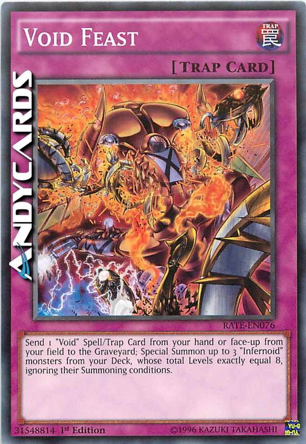 Send 1 "Void" Spell/Trap Card from your hand or face-up from your field to the Graveyard; Special Summon up to 3 "Infernoid" monsters from your Deck, whose total Levels exactly equal 8, ignoring their Summoning conditions.