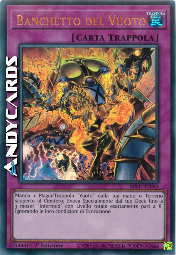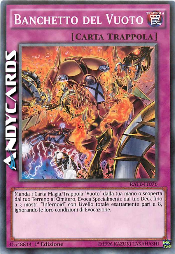 Manda 1 Carta Magia/Trappola "Vuoto" dalla tua mano o scoperta dal tuo Terreno al Cimitero; Evoca Specialmente dal tuo Deck fino a 3 mostri "Infernoid" con Livello totale esattamente pari a 8, ignorando le loro condizioni di Evocazione.