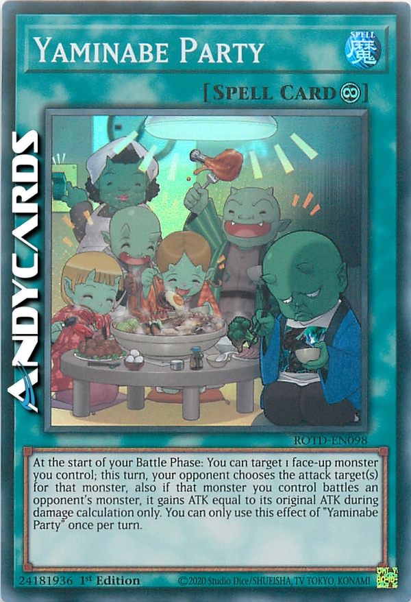 All'inizio della tua Battle Phase: puoi scegliere come bersaglio 1 mostro scoperto che controlli; in questo turno, il tuo avversario seleziona i bersagli degli attacchi di quel mostro, inoltre se quel mostro che controlli combatte con un mostro dell'avversario, esso guadagna ATK pari al suo ATK originale solamente durante il calcolo dei danni. Puoi utilizzare questo effetto di "Banchetto Yaminabe" una sola volta per turno.