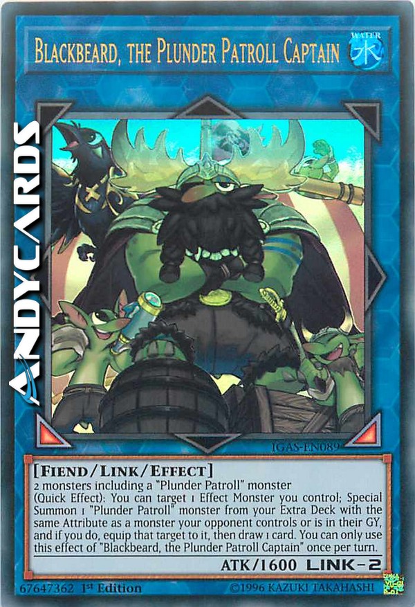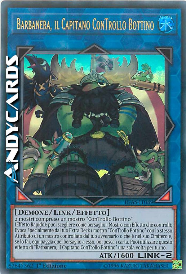 (Effetto Rapido): puoi scegliere come bersaglio 1 Mostro con Effetto che controlli; Evoca Specialmente dal tuo Extra Deck 1 mostro "ConTrollo Bottino" con lo stesso Attributo di un mostro controllato dal tuo avversario o che è nel suo Cimitero e, se lo fai, equipaggia quel bersaglio a esso, poi pesca 1 carta. Puoi utilizzare questo effetto di "Barbanera, il Capitano ConTrollo Bottino" una sola volta per turno.