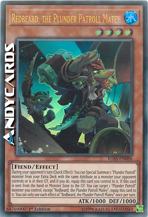 During your opponent's turn (Quick Effect): You can Special Summon 1 "Plunder Patroll" monster from your Extra Deck with the same Attribute as a monster your opponent controls or is in their GY, and if you do, equip this card you control to it. If this card is sent from the hand or Monster Zone to the GY: You can target 1 "Plunder Patroll" monster you control, except "Redbeard, the Plunder Patroll Matey"; equip this card to it. You can only use each effect of "Redbeard, the Plunder Patroll Matey" once per turn.