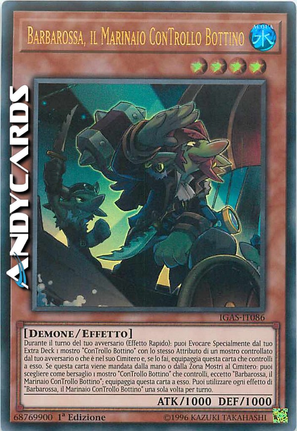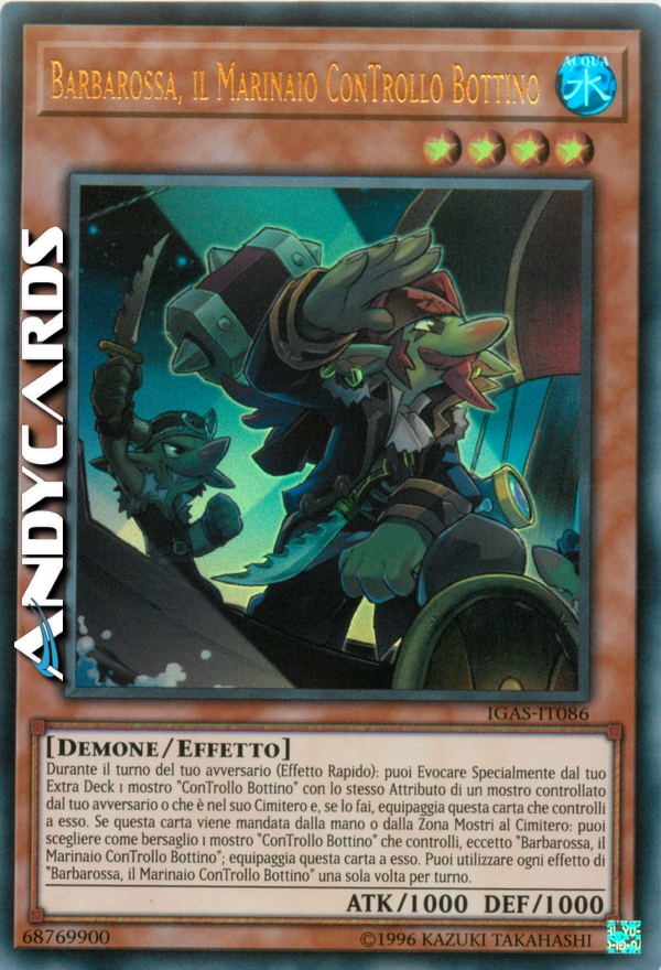 Durante il turno del tuo avversario (Effetto Rapido): puoi Evocare Specialmente dal tuo Extra Deck 1 mostro "ConTrollo Bottino" con lo stesso Attributo di un mostro controllato dal tuo avversario o che è nel suo Cimitero e, se lo fai, equipaggia questa carta che controlli a esso. Se questa carta viene mandata dalla mano o dalla Zona Mostri al Cimitero: puoi scegliere come bersaglio 1 mostro "ConTrollo Bottino" che controlli, eccetto "Barbarossa, il Marinaio ConTrollo Bottino"; equipaggia questa carta a esso. Puoi utilizzare ogni effetto di "Barbarossa, il Marinaio ConTrollo Bottino" una sola volta per turno.