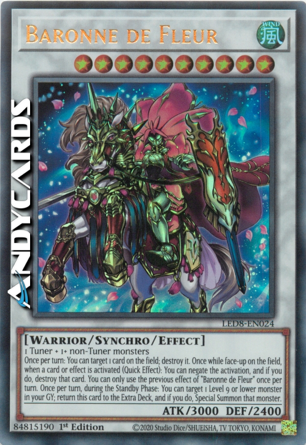 Once per turn: You can target 1 card on the field; destroy it. Once while face-up on the field, when a card or effect is activated (Quick Effect): You can negate the activation, and if you do, destroy that card. You can only use the previous effect of "Baronne de Fleur" once per turn. Once per turn, during the Standby Phase: You can target 1 Level 9 or lower monster in your GY; return this card to the Extra Deck, and if you do, Special Summon that monster.