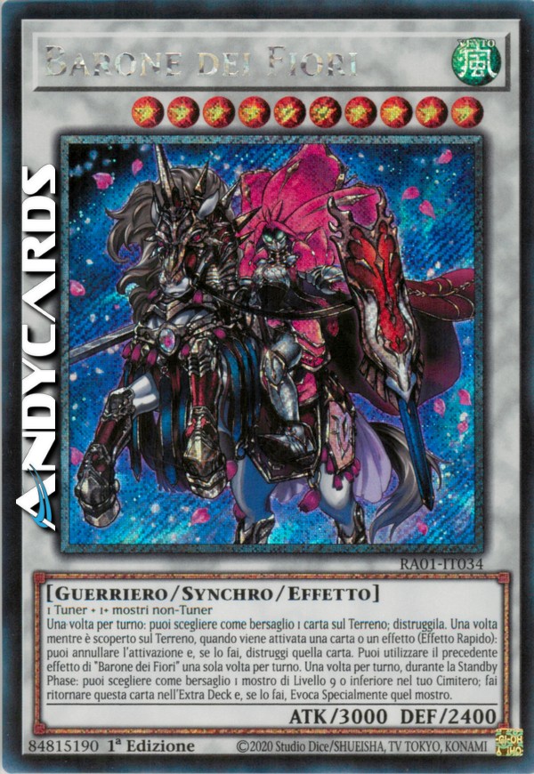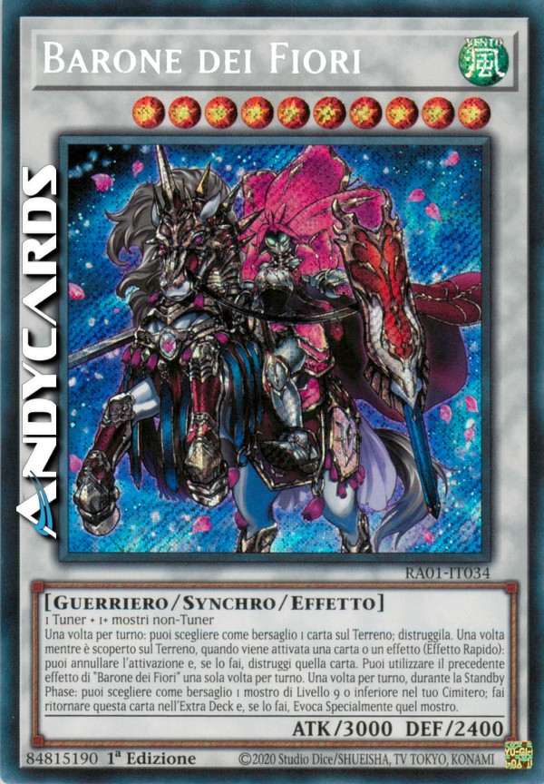 Una volta per turno: puoi scegliere come bersaglio 1 carta sul Terreno; distruggila. Una volta mentre è scoperto sul Terreno, quando viene attivata una carta o un effetto (Effetto Rapido): puoi annullare l'attivazione e, se lo fai, distruggi quella carta. Puoi utilizzare il precedente effetto di "Barone dei Fiori" una sola volta per turno. Una volta per turno, durante la Standby Phase: puoi scegliere come bersaglio 1 mostro di Livello 9 o inferiore nel tuo Cimitero; fai ritornare questa carta nell'Extra Deck e, se lo fai, Evoca Specialmente quel mostro.