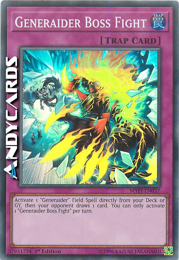 Attiva 1 Magia Terreno "Generaider" direttamente dal tuo Deck o Cimitero, poi il tuo avversario pesca 1 carta. Puoi attivare solo 1 "Battaglia Boss Generaider" per turno.