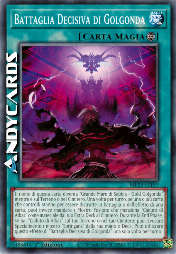 Il nome di questa carta diventa "Grande Mare di Sabbia - Gold Golgonda" mentre è sul Terreno o nel Cimitero. Una volta per turno, se una o più carte che controlli stanno per essere distrutte in battaglia o dall'effetto di una carta, puoi invece mandare 1 Mostro Fusione che menziona "Caduto di Albaz" come materiale dal tuo Extra Deck al Cimitero. Durante la End Phase, se hai "Caduto di Albaz" sul tuo Terreno o nel tuo Cimitero: puoi Evocare Specialmente 1 mostro "Springans" dalla tua mano o Deck. Puoi utilizzare questo effetto di "Battaglia Decisiva di Golgonda" una sola volta per turno.
