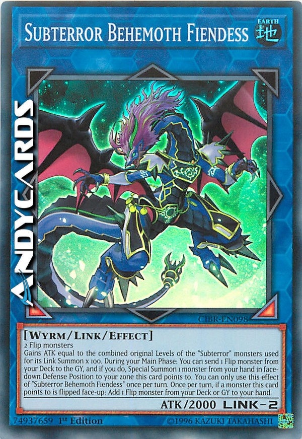 2 Flip monsters - Gains ATK equal to the combined original Levels of the "Subterror" monsters used for its Link Summon x 100. During your Main Phase: You can send 1 Flip monster from your Deck to the GY, and if you do, Special Summon 1 monster from your hand in face-down Defense Position to your zone this card points to. You can only use this effect of "Subterror Behemoth Fiendess" once per turn. Once per turn, if a monster this card points to is flipped face-up: Add 1 Flip monster from your Deck or GY to your hand.
