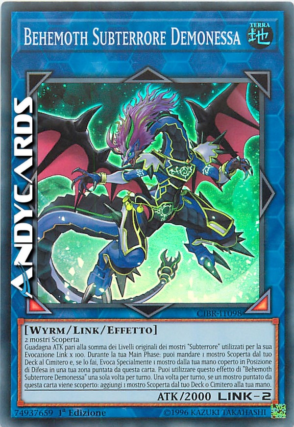 2 mostri Scoperta - Guadagna ATK pari alla somma dei Livelli originali dei mostri "Subterrore" utilizzati per la sua Evocazione Link x 100. Durante la tua Main Phase: puoi mandare 1 mostro Scoperta dal tuo Deck al Cimitero e, se lo fai, Evoca Specialmente 1 mostro dalla tua mano coperto in Posizione di Difesa in una tua zona puntata da questa carta. Puoi utilizzare questo effetto di "Behemoth Subterrore Demonessa" una sola volta per turno. Una volta per turno, se un mostro puntato da questa carta viene scoperto: aggiungi 1 mostro Scoperta dal tuo Deck o Cimitero alla tua mano.