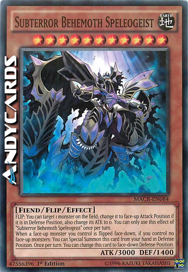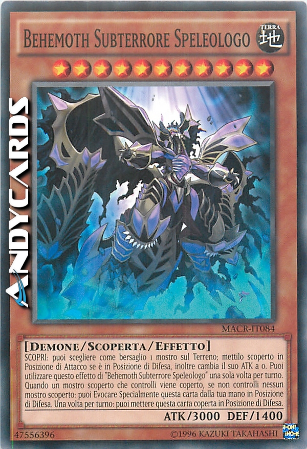 SCOPRI: puoi scegliere come bersaglio 1 mostro sul Terreno; mettilo scoperto in Posizione di Attacco se è in Posizione di Difesa, inoltre cambia il suo ATK a 0. Puoi utilizzare questo effetto di "Behemoth Subterrore Speleologo" una sola volta per turno. - Quando un mostro scoperto che controlli viene coperto, se non controlli nessun mostro scoperto: puoi Evocare Specialmente questa carta dalla tua mano in Posizione di Difesa. Una volta per turno: puoi mettere questa carta coperta in Posizione di Difesa.