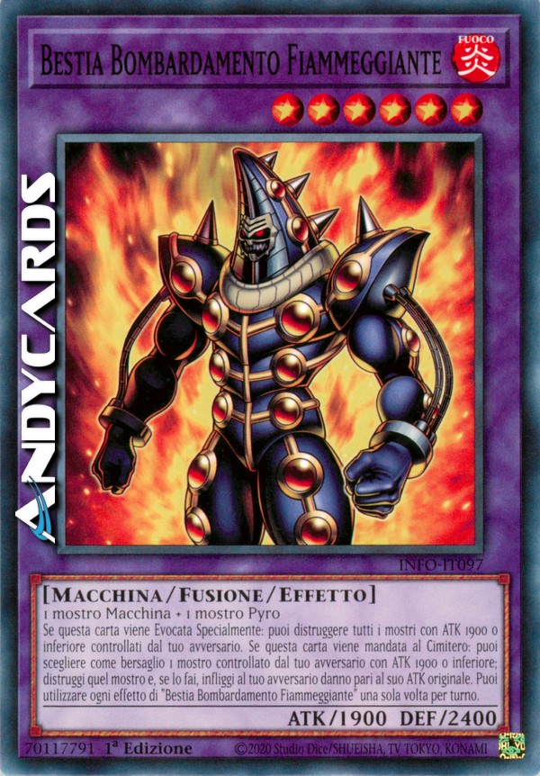 1 mostro Macchina + 1 mostro Pyro Se questa carta viene Evocata Specialmente: puoi distruggere tutti i mostri con ATK 1900 o inferiore controllati dal tuo avversario. Se questa carta viene mandata al Cimitero: puoi scegliere come bersaglio 1 mostro controllato dal tuo avversario con ATK 1900 o inferiore; distruggi quel mostro e, se lo fai, infliggi al tuo avversario danno pari al suo ATK originale. Puoi utilizzare ogni effetto di "Bestia Bombardamento Fiammeggiante" una sola volta per turno.