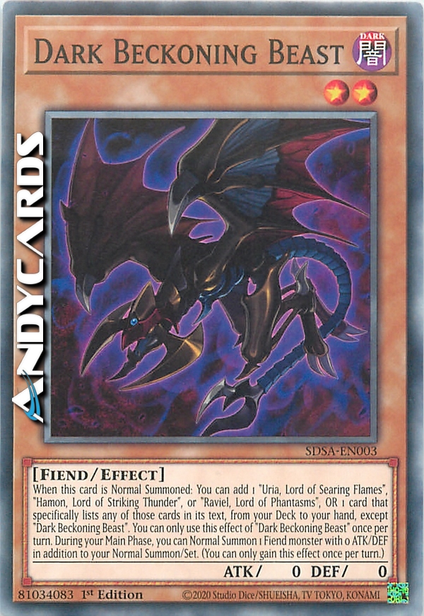 When this card is Normal Summoned: You can add 1 "Uria, Lord of Searing Flames", "Hamon, Lord of Striking Thunder", or "Raviel, Lord of Phantasms", OR 1 card that specifically lists any of those cards in its text, from your Deck to your hand, except "Dark Beckoning Beast". You can only use this effect of "Dark Beckoning Beast" once per turn. During your Main Phase, you can Normal Summon 1 Fiend monster with 0 ATK/DEF in addition to your Normal Summon/Set. (You can only gain this effect once per turn.)