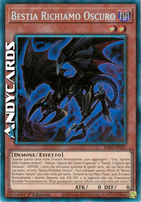 Quando questa carta viene Evocata Normalmente: puoi aggiungere 1 "Uria, Signore delle Fiamme Ardenti", "Hamon, Signore del Tuono Fragoroso" o "Raviel, il Signore dei Fantasmi", OPPURE 1 carta che indica specificamente qualsiasi di quelle carte nel suo testo, dal tuo Deck alla tua mano, eccetto "Bestia Richiamo Oscuro". Puoi utilizzare questo effetto di "Bestia Richiamo Oscuro" una sola volta per turno. Durante la tua Main Phase, puoi Evocare Normalmente 1 mostro Demone con ATK/DEF 0 in aggiunta alla tua Evocazione Normale/Posizionamento. (Puoi guadagnare questo effetto una sola volta per turno.)