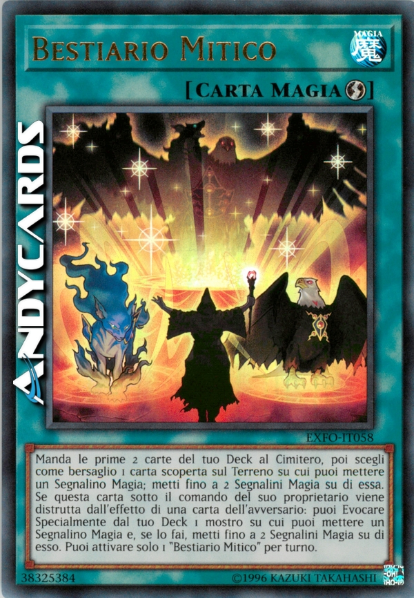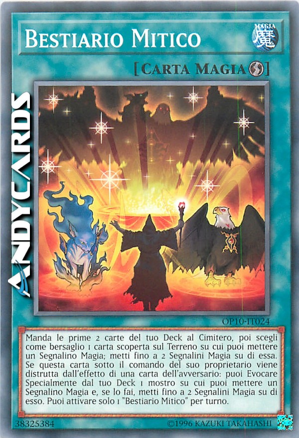 Manda le prime 2 carte del tuo Deck al Cimitero, poi scegli come bersaglio 1 carta scoperta sul Terreno su cui puoi mettere un Segnalino Magia; metti fino a 2 Segnalini Magia su di essa. Se questa carta sotto il comando del suo proprietario viene distrutta dall'effetto di una carta dell'avversario: puoi Evocare Specialmente dal tuo Deck 1 mostro su cui puoi mettere un Segnalino Magia e, se lo fai, metti fino a 2 Segnalini Magia su di esso. Puoi attivare solo 1 "Bestiario Mitico" per turno.