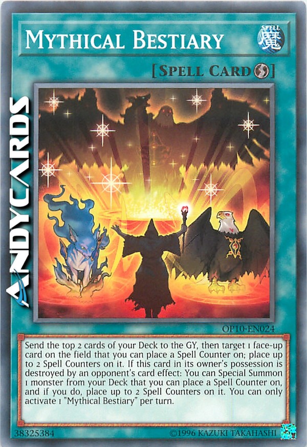 Send the top 2 cards of your Deck to the GY, then target 1 face-up card on the field that you can place a Spell Counter on; place up to 2 Spell Counters on it. If this card in its owner's possession is destroyed by an opponent's card effect: You can Special Summon 1 monster from your Deck that you can place a Spell Counter on, and if you do, place up to 2 Spell Counters on it. You can only activate 1 "Mythical Bestiary" per turn.