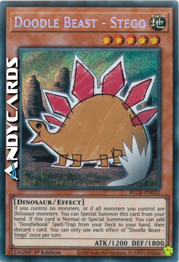 If you control no monsters, or if all monsters you control are Dinosaur monsters: You can Special Summon this card from your hand. If this card is Normal or Special Summoned: You can add 1 "Doodlebook" Spell/Trap from your Deck to your hand, then discard 1 card. You can only use each effect of "Doodle Beast - Stego" once per turn.