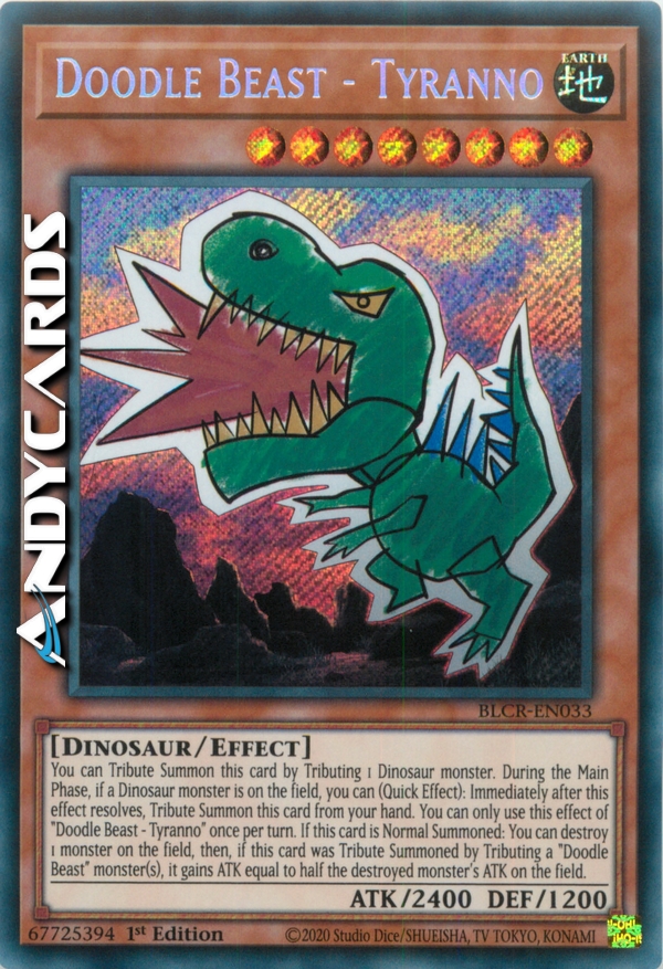 You can Tribute Summon this card by Tributing 1 Dinosaur monster. During the Main Phase, if a Dinosaur monster is on the field, you can (Quick Effect): Immediately after this effect resolves, Tribute Summon this card from your hand. You can only use this effect of "Doodle Beast - Tyranno" once per turn. If this card is Normal Summoned: You can destroy 1 monster on the field, then, if this card was Tribute Summoned by Tributing a "Doodle Beast" monster(s), it gains ATK equal to half the destroyed monster's ATK on the field.