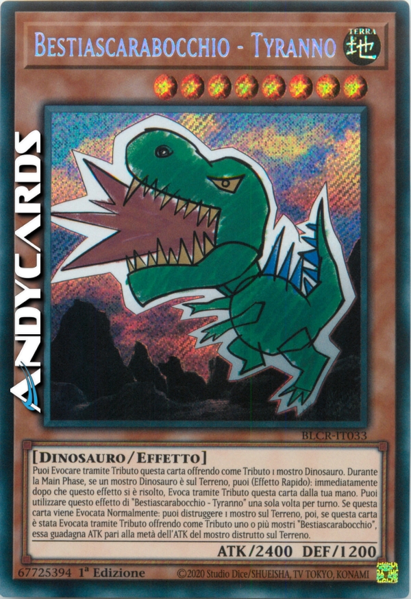 Puoi Evocare tramite Tributo questa carta offrendo come Tributo 1 mostro Dinosauro. Durante la Main Phase, se un mostro Dinosauro è sul Terreno, puoi (Effetto Rapido): immediatamente dopo che questo effetto si è risolto, Evoca tramite Tributo questa carta dalla tua mano. Puoi utilizzare questo effetto di "Bestiascarabocchio - Tyranno" una sola volta per turno. Se questa carta viene Evocata Normalmente: puoi distruggere 1 mostro sul Terreno, poi, se questa carta è stata Evocata tramite Tributo offrendo come Tributo uno o più mostri "Bestiascarabocchio", essa guadagna ATK pari alla metà dell'ATK del mostro distrutto sul Terreno.