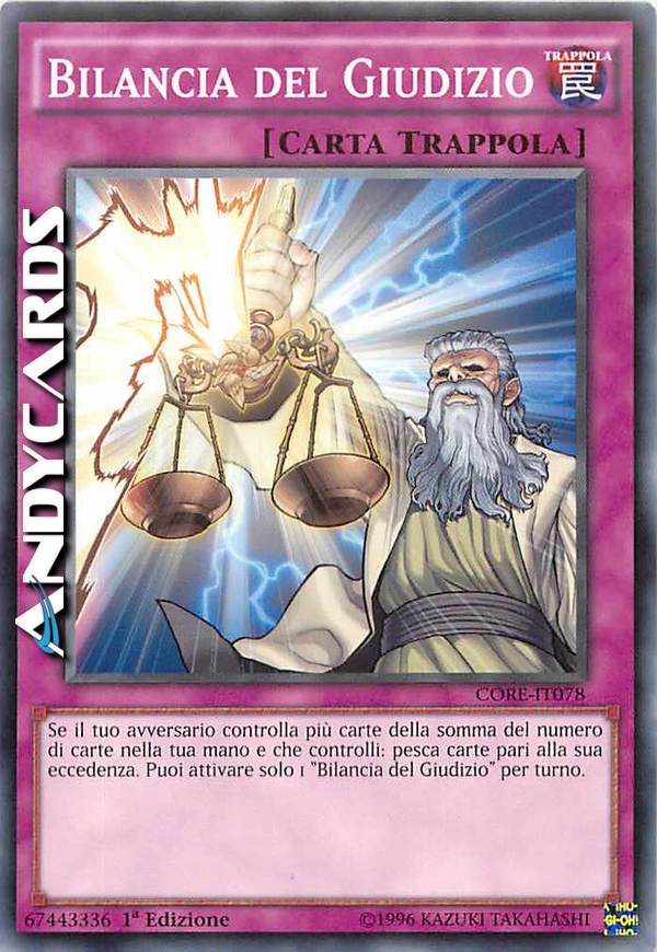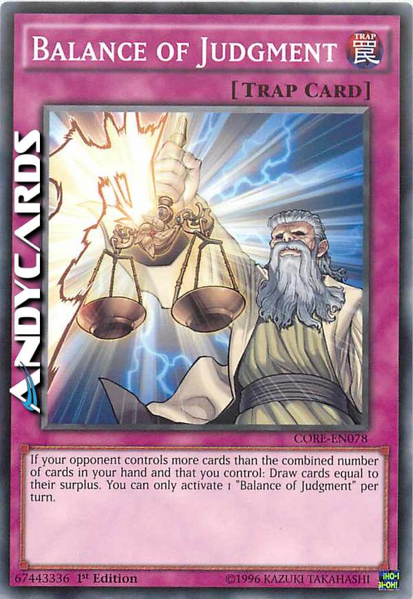 Se il tuo avversario controlla più carte della somma del numero di carte nella tua mano e che controlli: pesca carte pari alla sua eccedenza. Puoi attivare solo 1 "Bilancia del Giudizio" per turno.