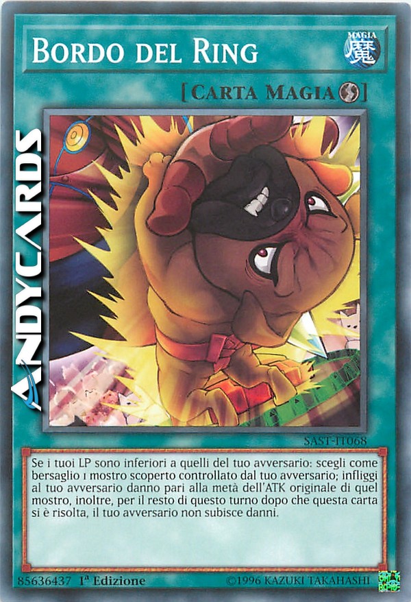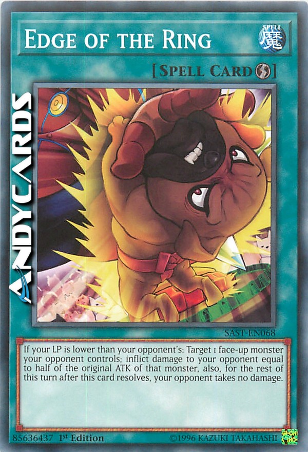 Se i tuoi LP sono inferiori a quelli del tuo avversario: scegli come bersaglio 1 mostro scoperto controllato dal tuo avversario; infliggi al tuo avversario danno pari alla metà dell'ATK originale di quel mostro, inoltre, per il resto di questo turno dopo che questa carta si è risolta, il tuo avversario non subisce danni.
