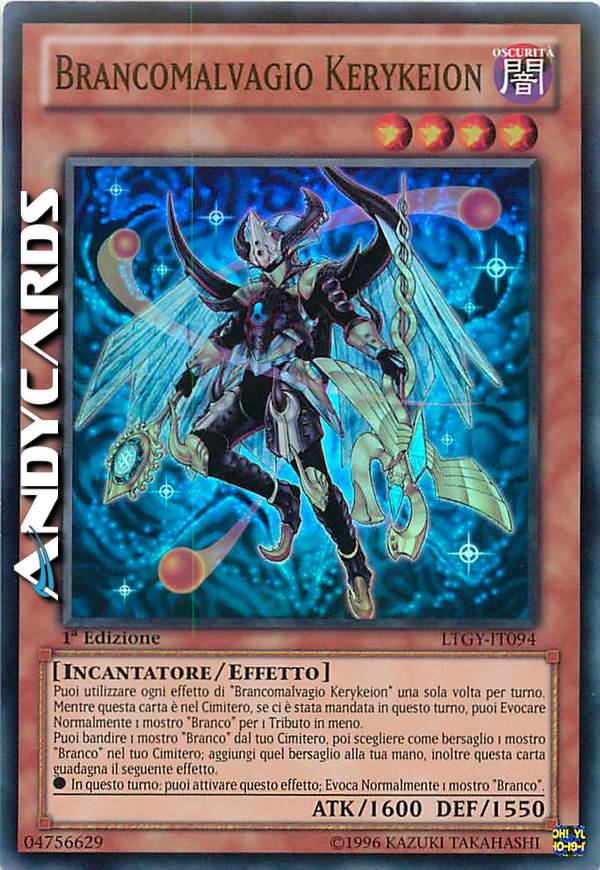 Puoi utilizzare ogni effetto di "Brancomalvagio Kerykeion" una sola volta per turno. Mentre questa carta è nel Cimitero, se ci è stata mandata in questo turno, puoi Evocare Normalmente 1 mostro "Branco" per 1 Tributo in meno. Puoi bandire 1 mostro "Branco" dal tuo Cimitero, poi scegliere come bersaglio 1 mostro "Branco" nel tuo Cimitero; aggiungi quel bersaglio alla tua mano, inoltre questa carta guadagna il seguente effetto. ?In questo turno: puoi attivare questo effetto; Evoca Normalmente 1 mostro "Branco".