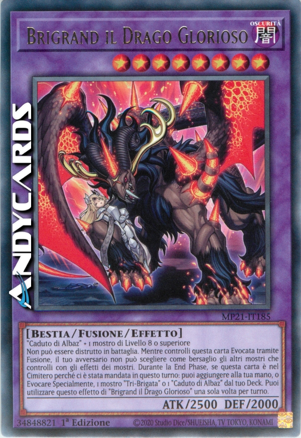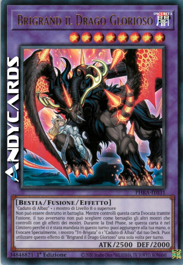Non può essere distrutto in battaglia. Mentre controlli questa carta Evocata tramite Fusione, il tuo avversario non può scegliere come bersaglio gli altri mostri che controlli con gli effetti dei mostri. Durante la End Phase, se questa carta è nel Cimitero perché è stata mandata lì in questo turno: puoi aggiungere alla tua mano, o Evocare Specialmente, 1 mostro "Tri-Brigata" o 1 "Caduto di Albaz" dal tuo Deck. Puoi utilizzare questo effetto di "Brigrand il Drago Glorioso" una sola volta per turno.