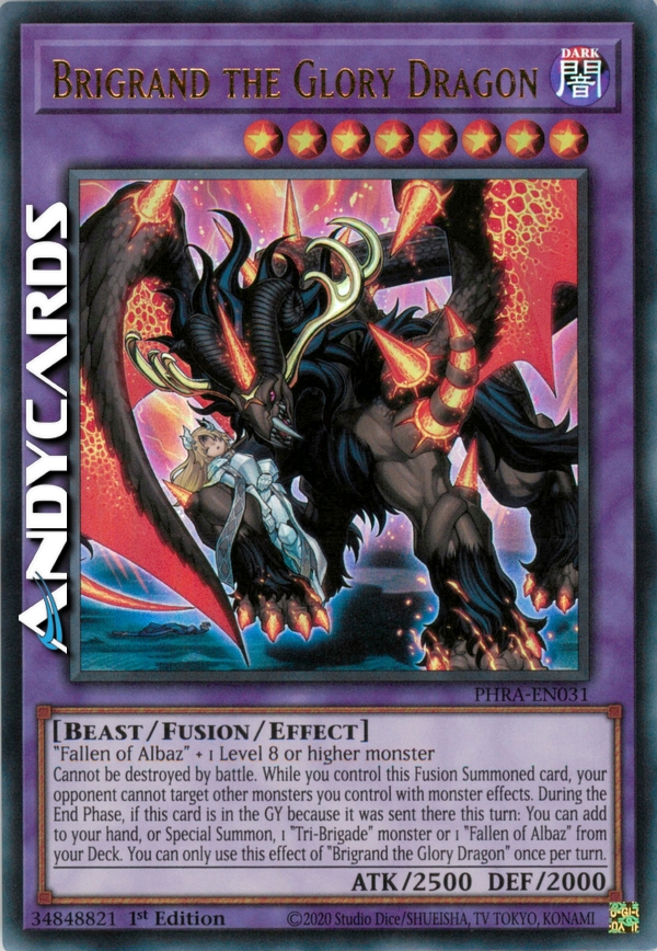 Cannot be destroyed by battle. While you control this Fusion Summoned card, your opponent cannot target other monsters you control with monster effects. During the End Phase, if this card is in the GY because it was sent there this turn: You can add to your hand, or Special Summon, 1 "Tri-Brigade" monster or 1 "Fallen of Albaz" from your Deck. You can only use this effect of "Brigrand the Glory Dragon" once per turn.
