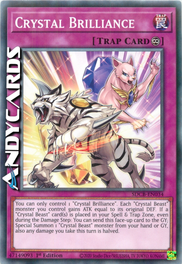You can only control 1 "Crystal Brilliance". Each "Crystal Beast" monster you control gains ATK equal to its original DEF. If a "Crystal Beast" card(s) is placed in your Spell & Trap Zone, even during the Damage Step: You can send this face-up card to the GY; Special Summon 1 "Crystal Beast" monster from your hand or GY, also any damage you take this turn is halved.