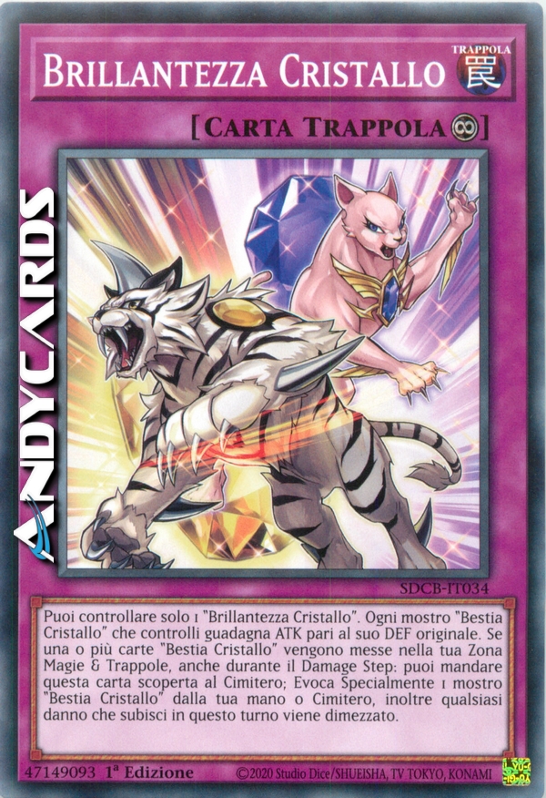 Puoi controllare solo 1 "Brillantezza Cristallo". Ogni mostro "Bestia Cristallo" che controlli guadagna ATK pari al suo DEF originale. Se una o più carte "Bestia Cristallo" vengono messe nella tua Zona Magie & Trappole, anche durante il Damage Step: puoi mandare questa carta scoperta al Cimitero; Evoca Specialmente 1 mostro "Bestia Cristallo" dalla tua mano o Cimitero, inoltre qualsiasi danno che subisci in questo turno viene dimezzato.