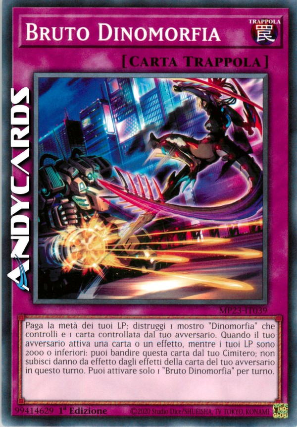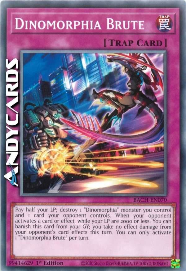 Paga la metà dei tuoi LP; distruggi 1 mostro "Dinomorfia" che controlli e 1 carta controllata dal tuo avversario. Quando il tuo avversario attiva una carta o un effetto, mentre i tuoi LP sono 2000 o inferiori: puoi bandire questa carta dal tuo Cimitero; non subisci danno da effetto dagli effetti della carta del tuo avversario in questo turno. Puoi attivare solo 1 "Bruto Dinomorfia" per turno.