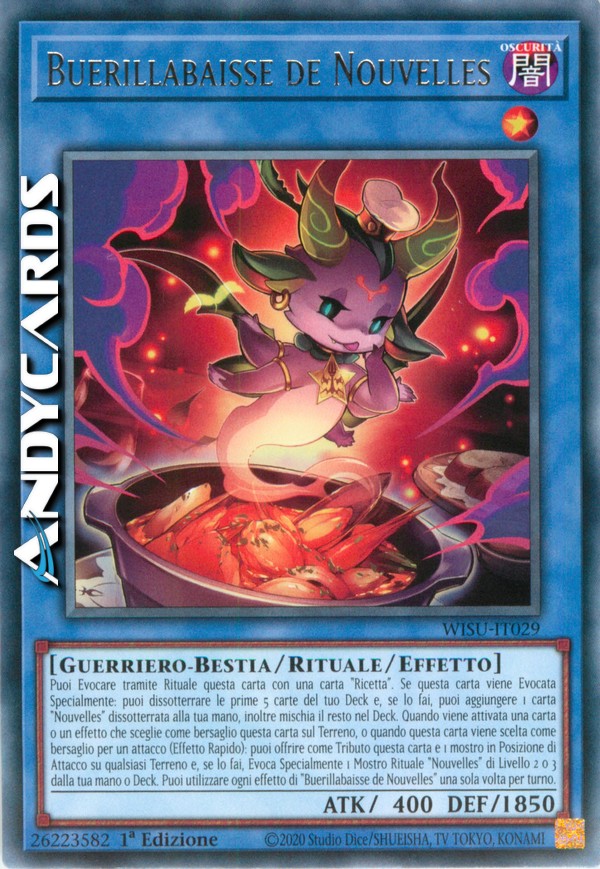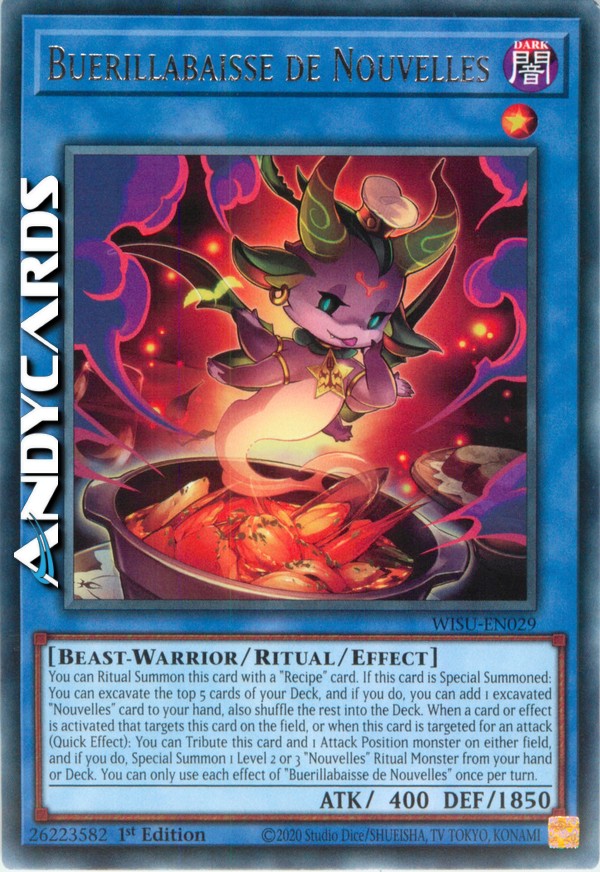 You can Ritual Summon this card with a "Recipe" card. If this card is Special Summoned: You can excavate the top 5 cards of your Deck, and if you do, you can add 1 excavated "Nouvelles" card to your hand, also shuffle the rest into the Deck. When a card or effect is activated that targets this card on the field, or when this card is targeted for an attack (Quick Effect): You can Tribute this card and 1 Attack Position monster on either field, and if you do, Special Summon 1 Level 2 or 3 "Nouvelles" Ritual Monster from your hand or Deck. You can only use each effect of "Buerillabaisse de Nouvelles" once per turn.